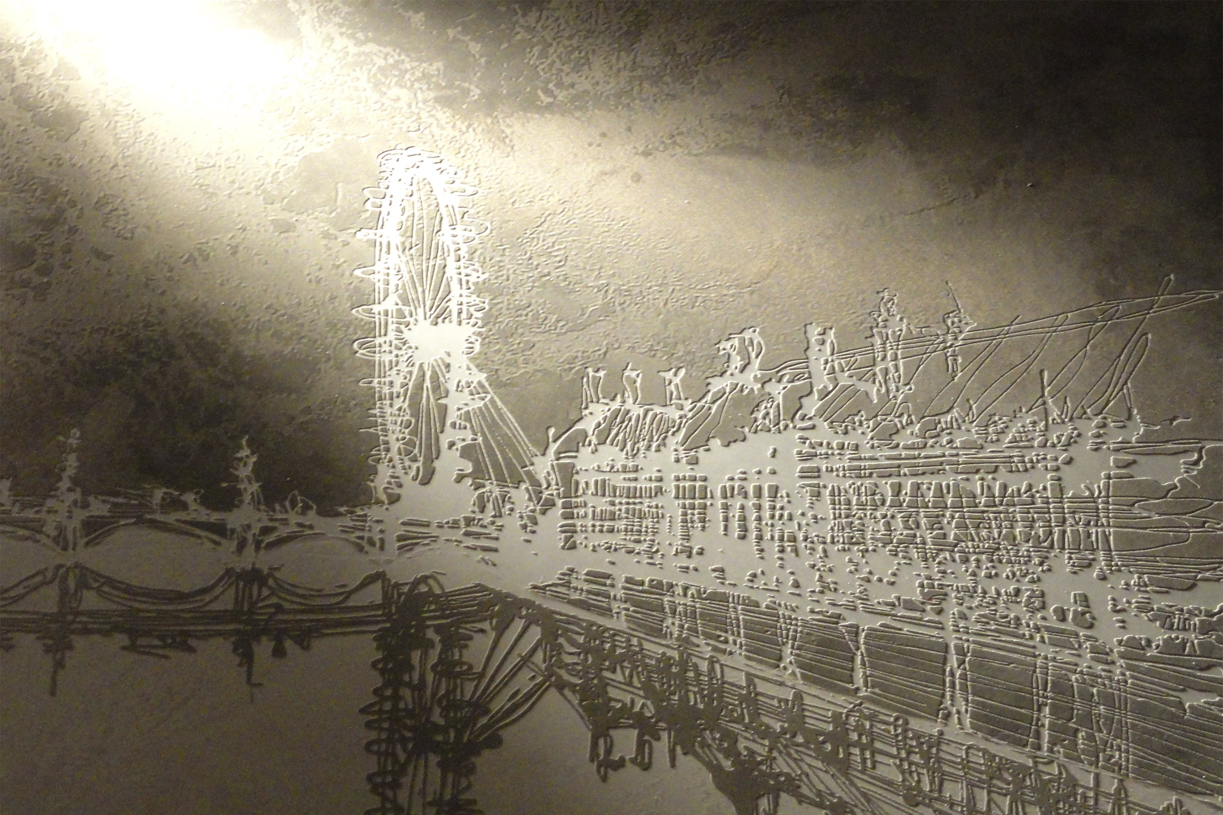 The exhibition was a collaboration between Ingo and Graphic Relief. Ingo works by drizzling acrylic paints on large canvasses to give a fluid, organic effect. Working from digital copies of the canvasses we manufactured mould which recreated this fluidity in the surface of the concrete.
